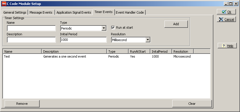 The Timer Events tab allows you to create a timer event at regular or single shot intervals.