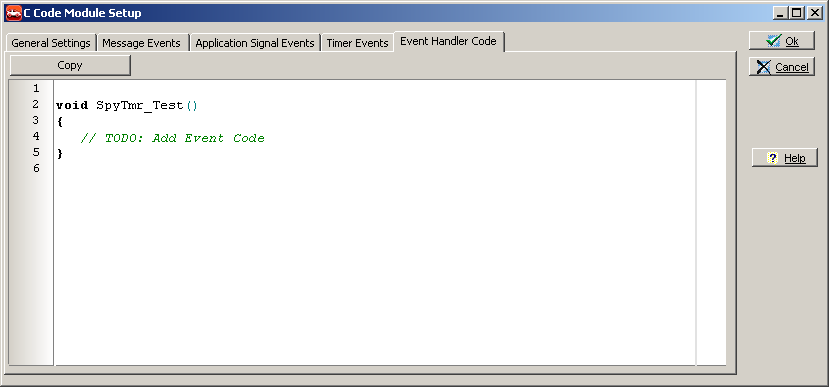 After a new project is created, you can edit it by clicking the "Edit" button in the C Code interface. In the setup dialog you can add event functions and change the name and description of the project. For setup of the event functions, please see the following sections for message, application signal and timer events. If you create event functions, please make sure to manually copy the event handler code to your SpyCCode.c file. This will help you avoid a linker error when building your project.
