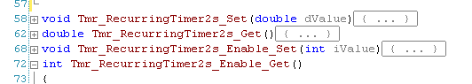 The automatically generated code was designed for developer productivity. So, features like the Visual Studio intellisense works well to automatically find database messages, Vehicle Spy API's, and application signal environmental variables.